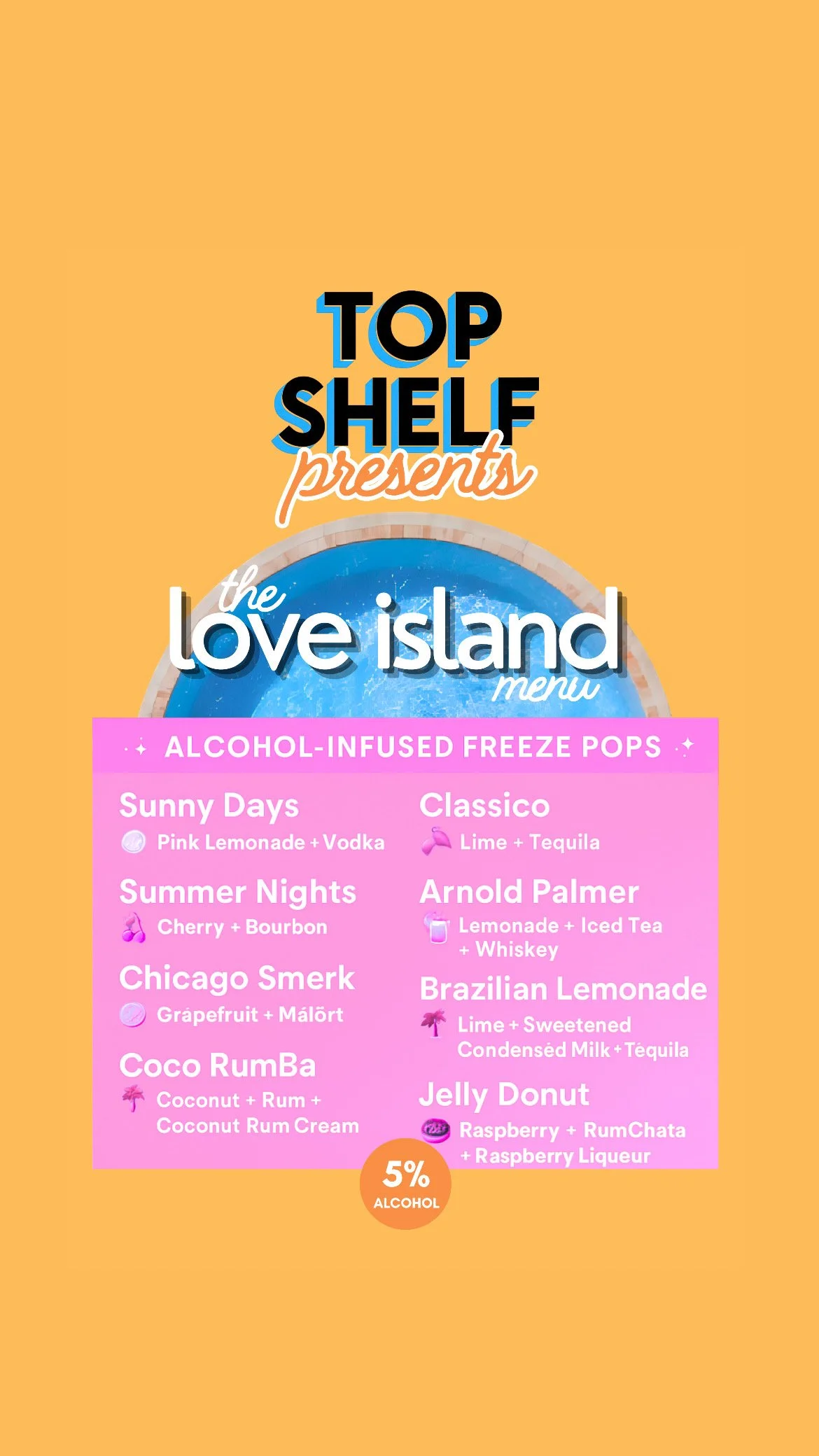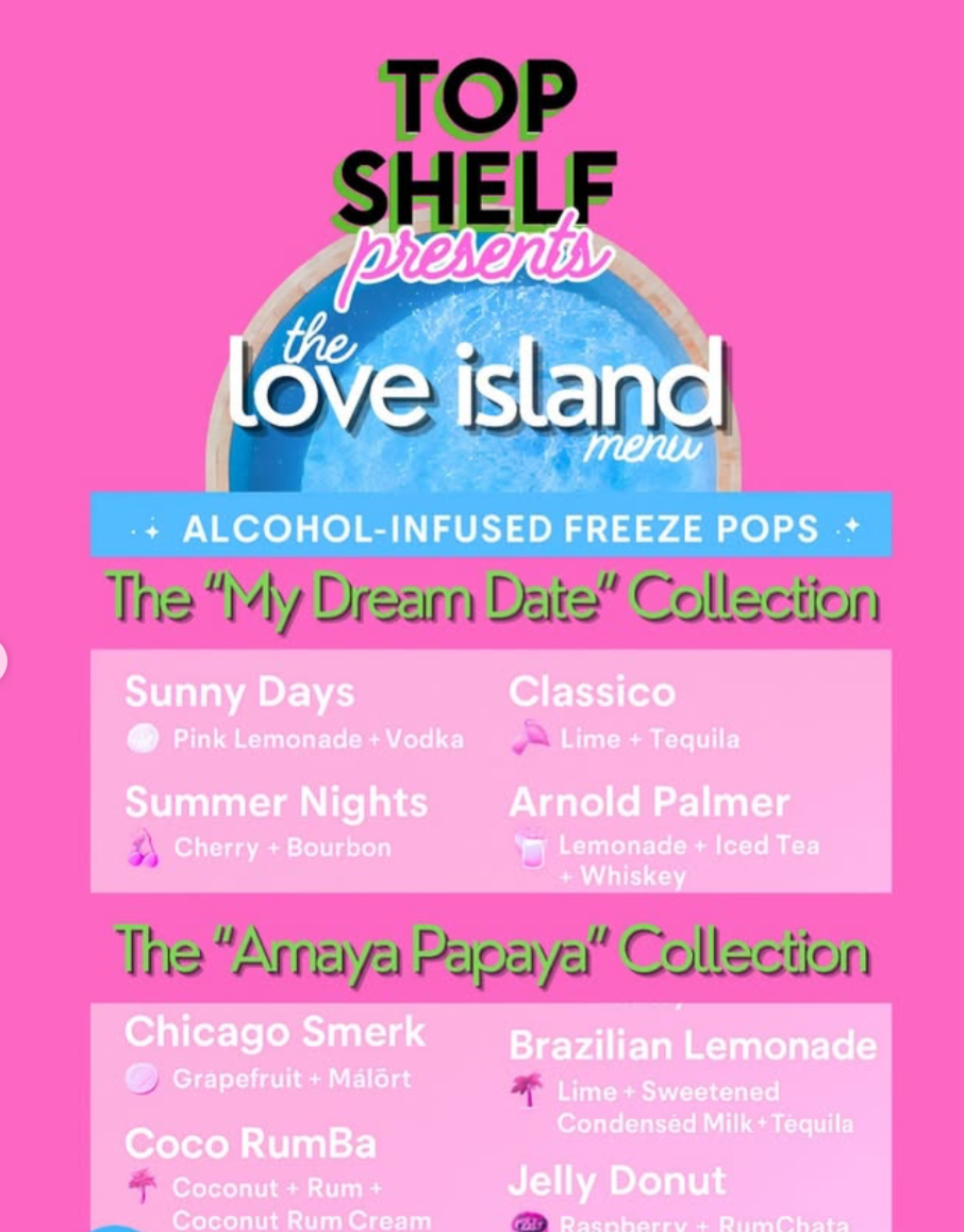 For the Top Shelf Freeze Pops Love Island Finale Watch Party, I created a cohesive set of event visuals to support both promotion and the on-site experience. I designed custom printed menus featuring the signature alcohol-infused flavors, branded screen graphics for the watch party, and promotional assets for social media to drive attendance. The visuals were clean, on-theme, and aligned with Top Shelf’s branding, ensuring consistency across digital marketing and in-person event materials.
